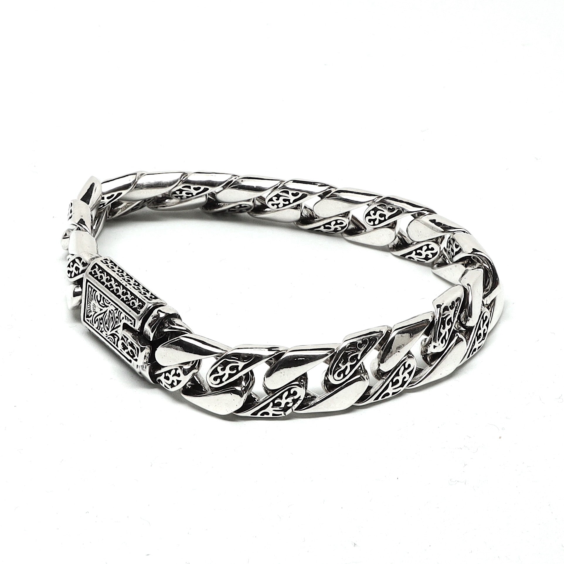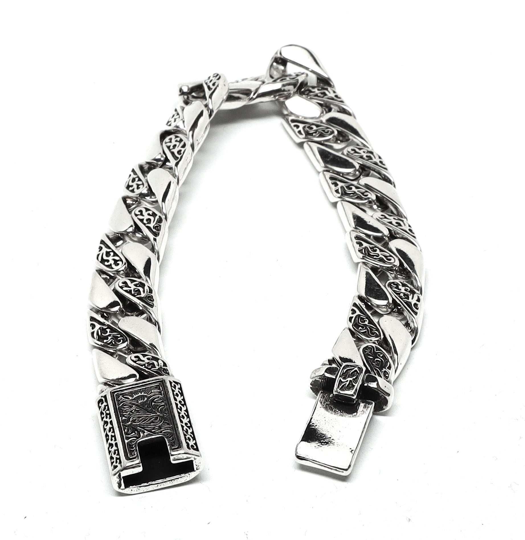Crafted from high-quality, tarnish-resistant stainless steel, this bracelet features a bold Curb Cuban Styled chain with thick durable links. Every link is meticulously polished with scattered engraving with beautiful art designs. The designs are inspired by old techniques to give this piece a timeless feel. The buckle latch makes a unique and easy way to secure the bracelet.