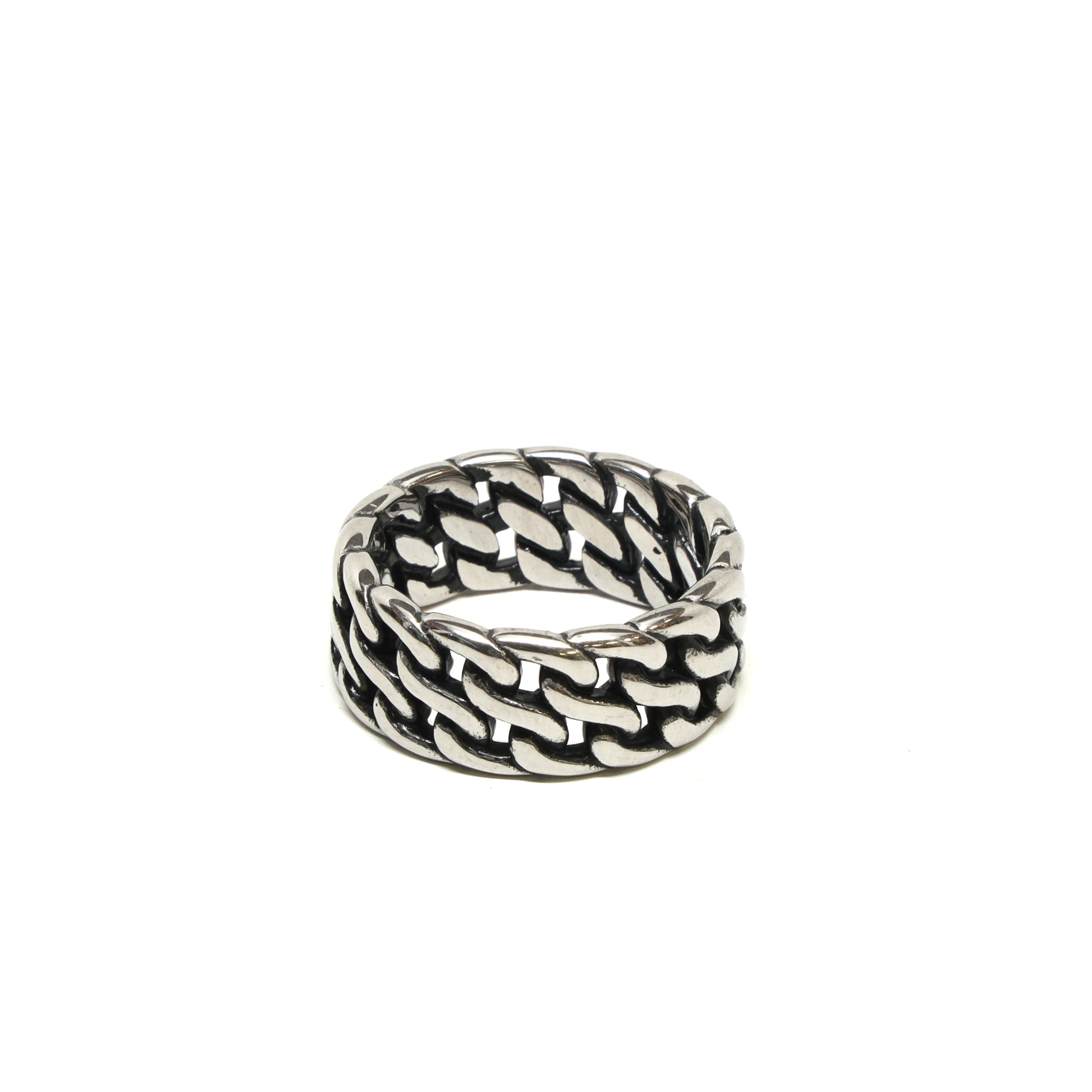 Stainless Steel Oxidized Ring. Crafted from high-quality, tarnish-resistant stainless steel, this ring features a striking finish and design with industrial quality. Three chain links weaved together to create a beautiful bold design.