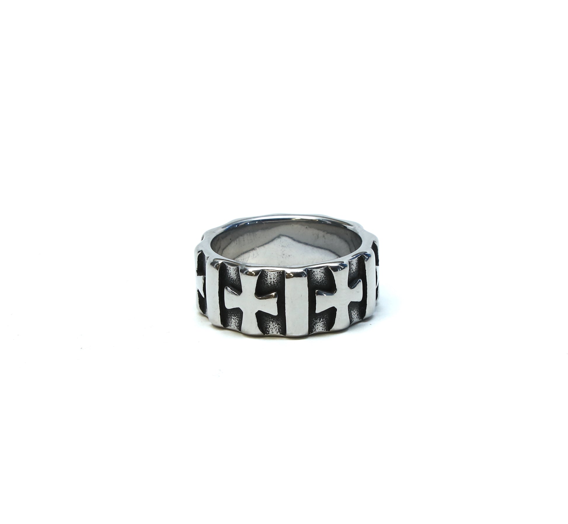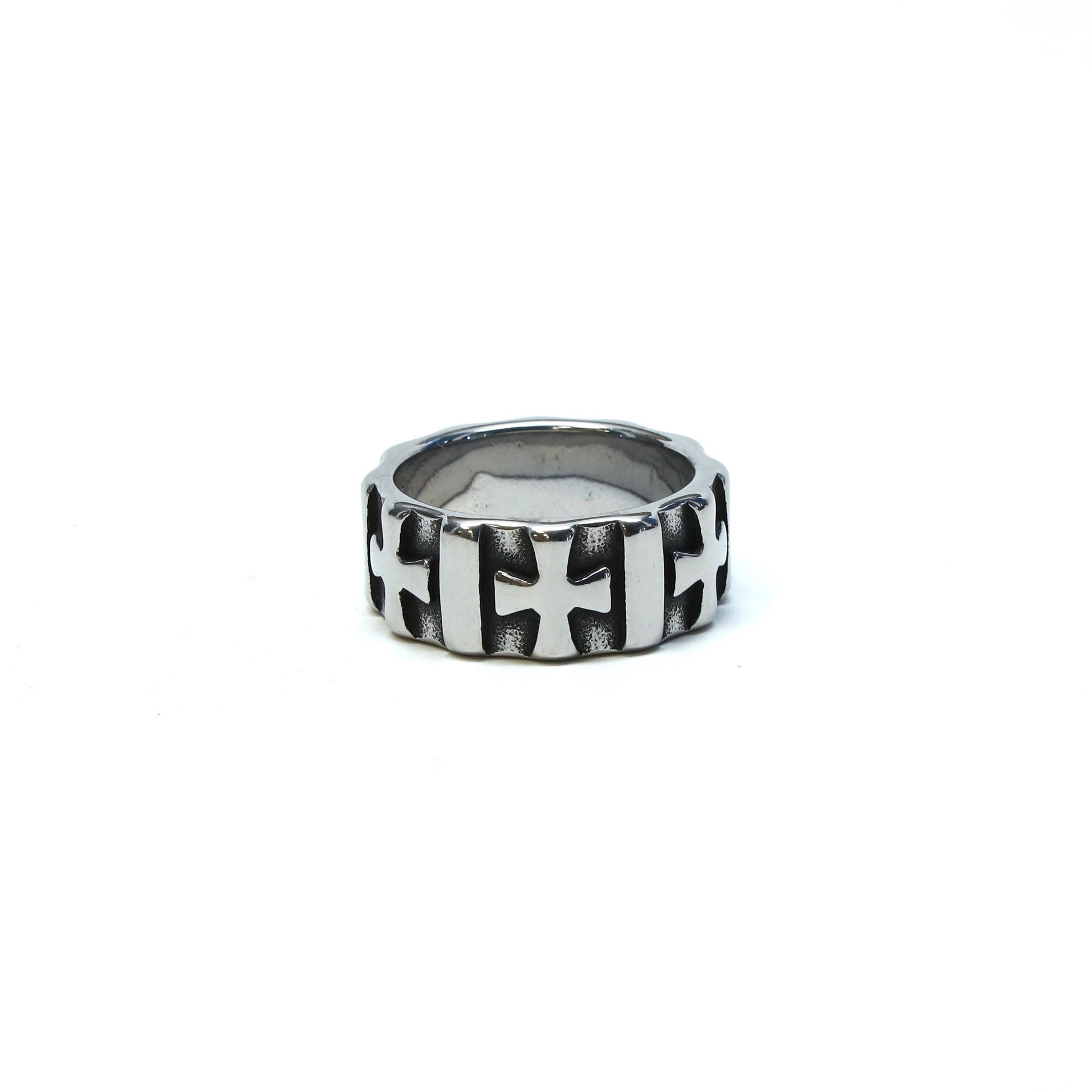 Oxidized Ring crafted from high-quality, tarnish-resistant, stainless steel. This unisex ring features a Maltese cross pattern that wrap around the entire band. The added oxidized crevices add depth and appeal to each cross.