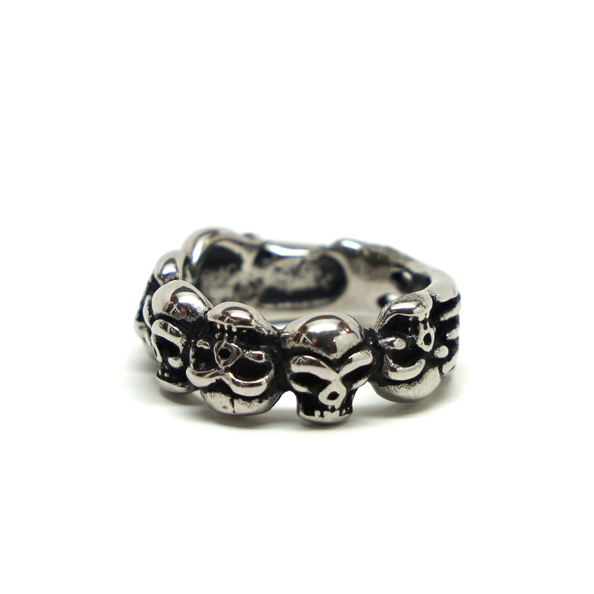 Crafted from high-quality, tarnish-resistant stainless steel, this ring has a continuous row of sculpted skulls that wrap around as a band. The recessed areas are oxidized to emphasize contrast, while the polished surfaces catch the light for a striking shine.