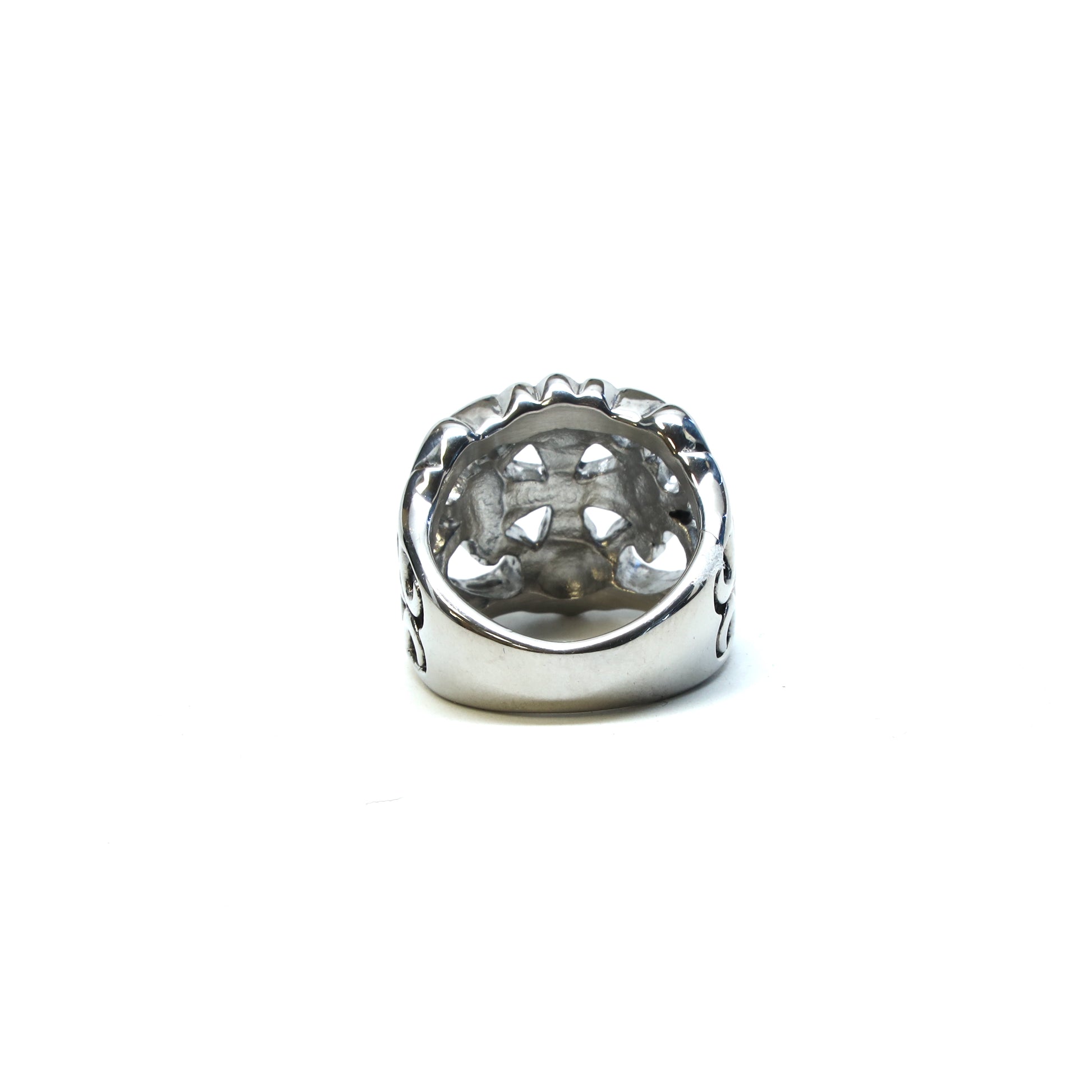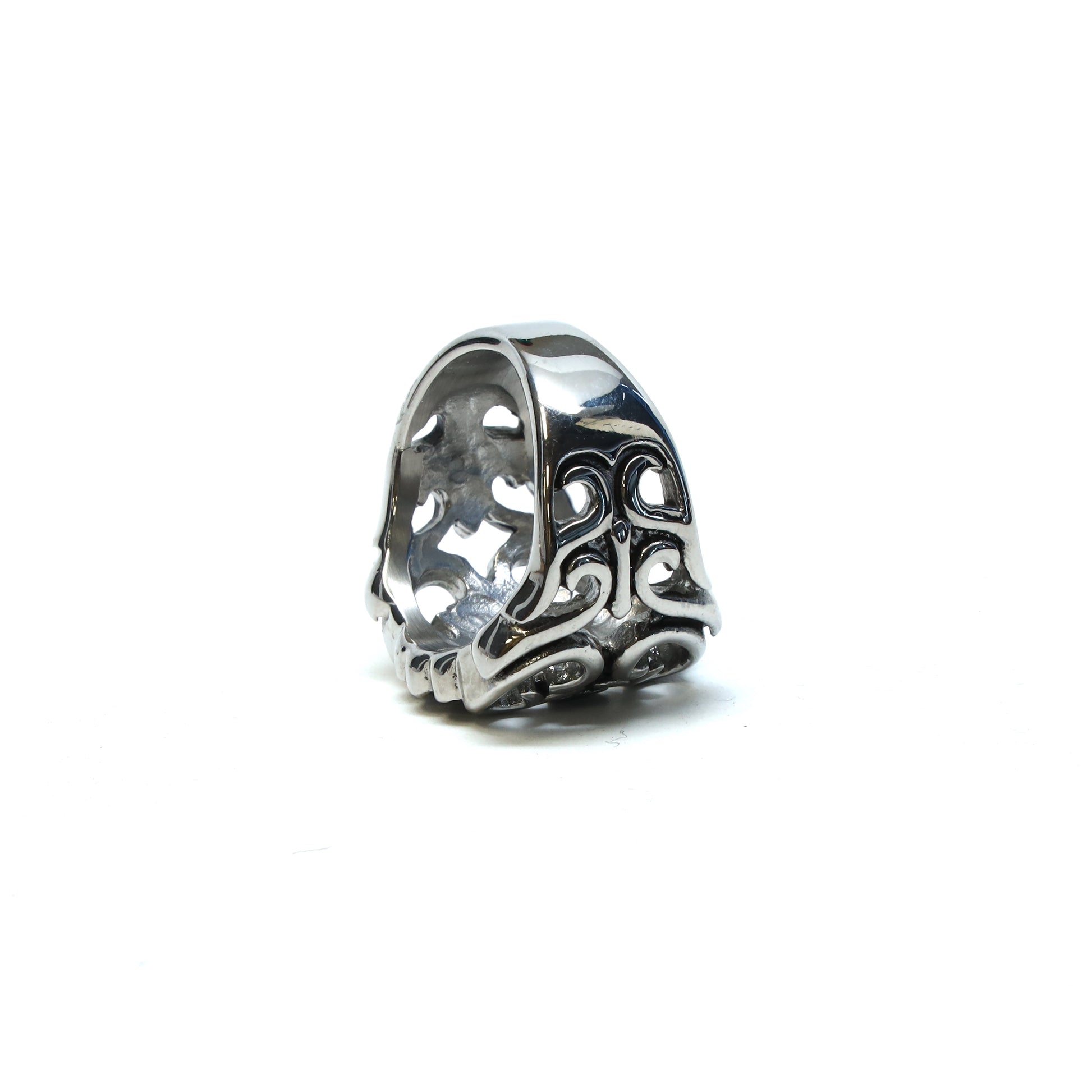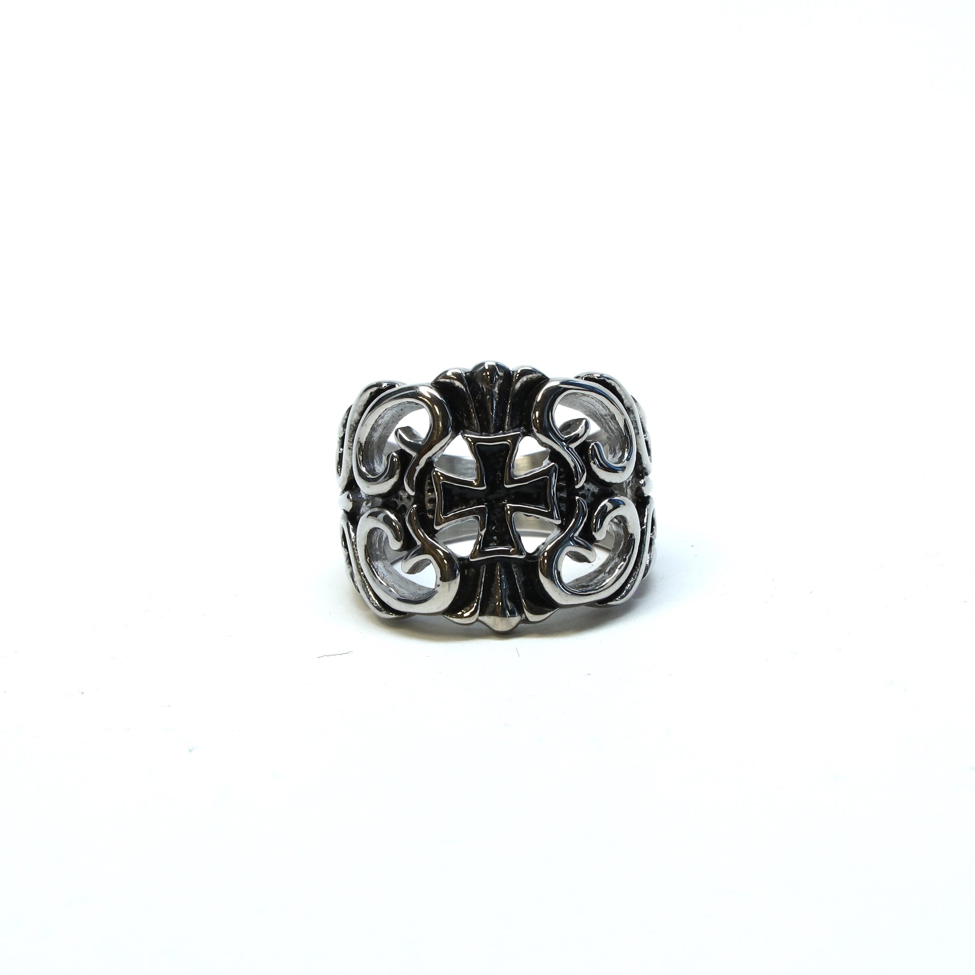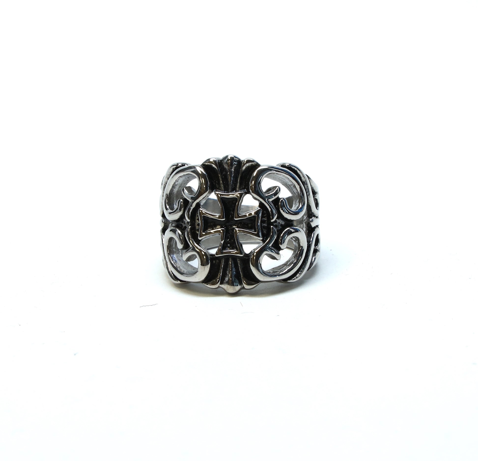 Oxidized Ring crafted from high-quality, tarnish-resistant stainless steel. The ring's design features a prominent cross centerpiece similar to our gothic cross ring, but this one is designed with with beautiful Arches behind the cross surrounded by loops in the artwork. The polished finish from the stainless steel enhances the textures, providing a striking contrast against the darker embedded backgrounds.