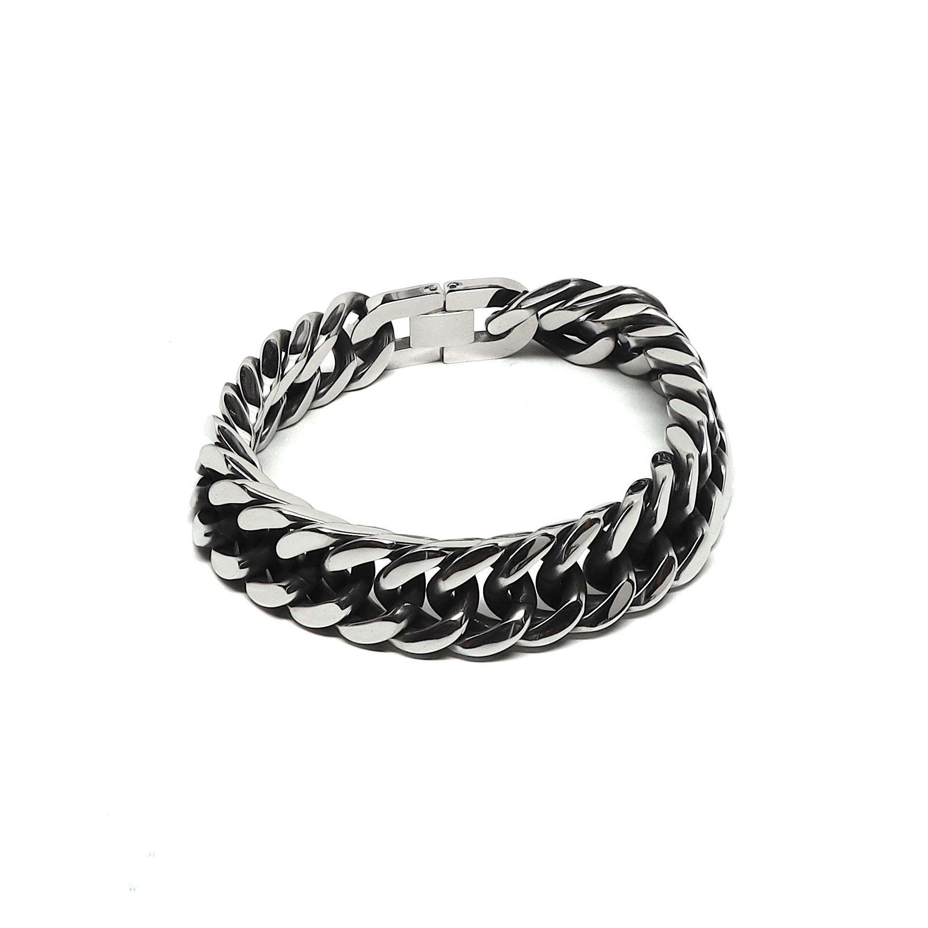 Crafted from high-quality, tarnish-resistant stainless steel, this bracelet is a hefty curb styled Cuban with double the links. The links are heavily oxidized in between the interlocking of each connecting loop. The Links are tight but maintain just the amount of space to give an amazing look and feel. The uniquely clean 'snap lock latch' design gives the Bracelet a one of a kind look.