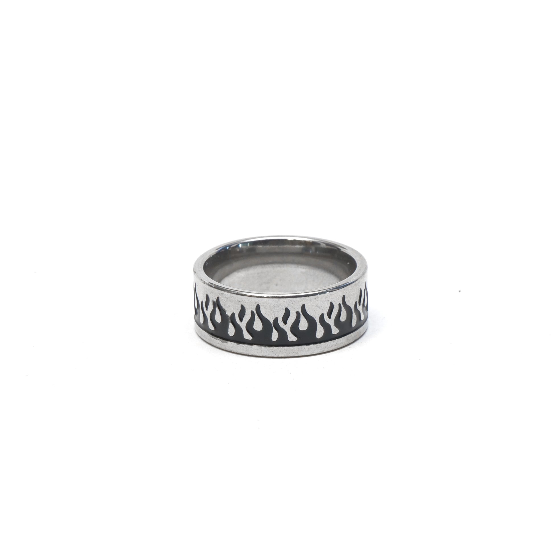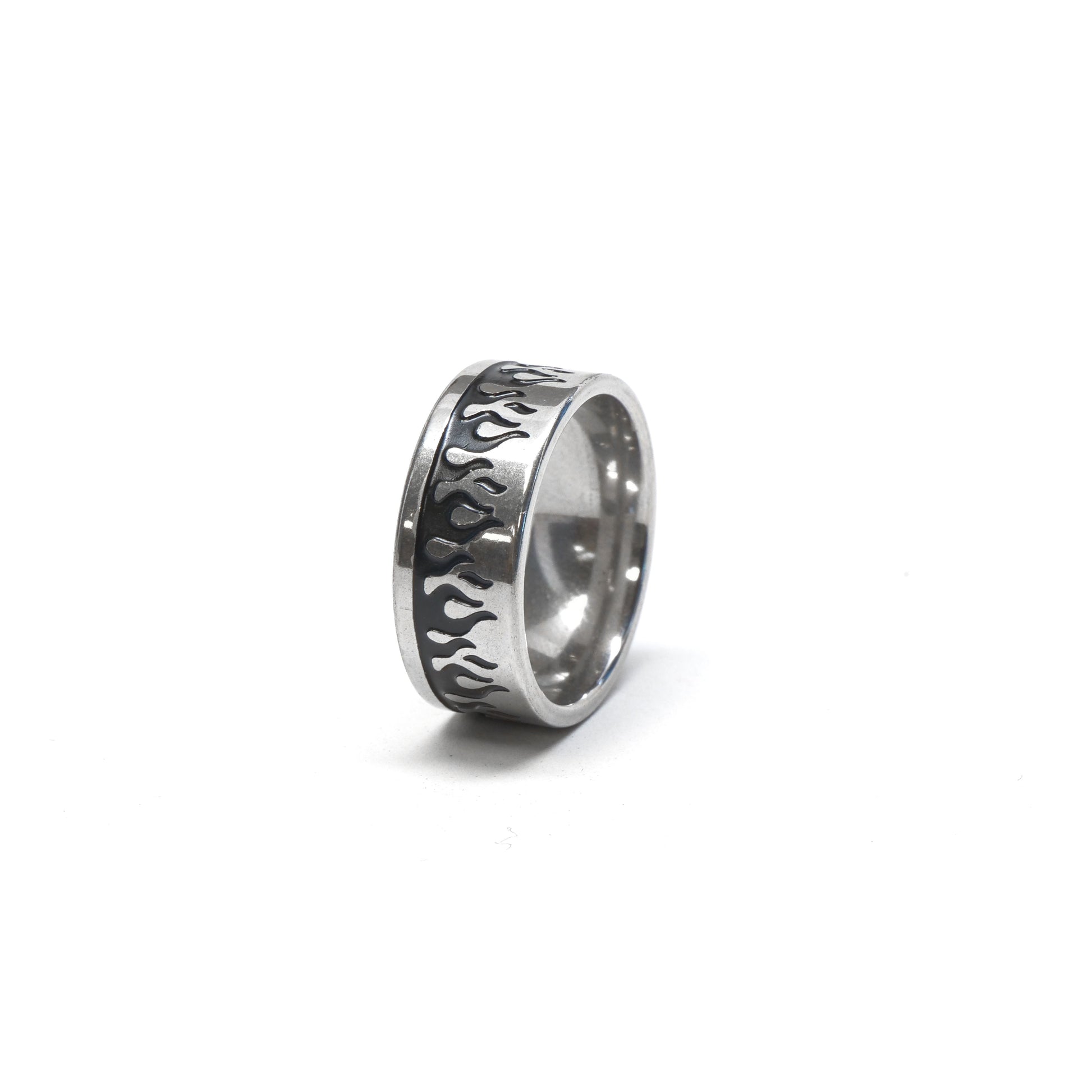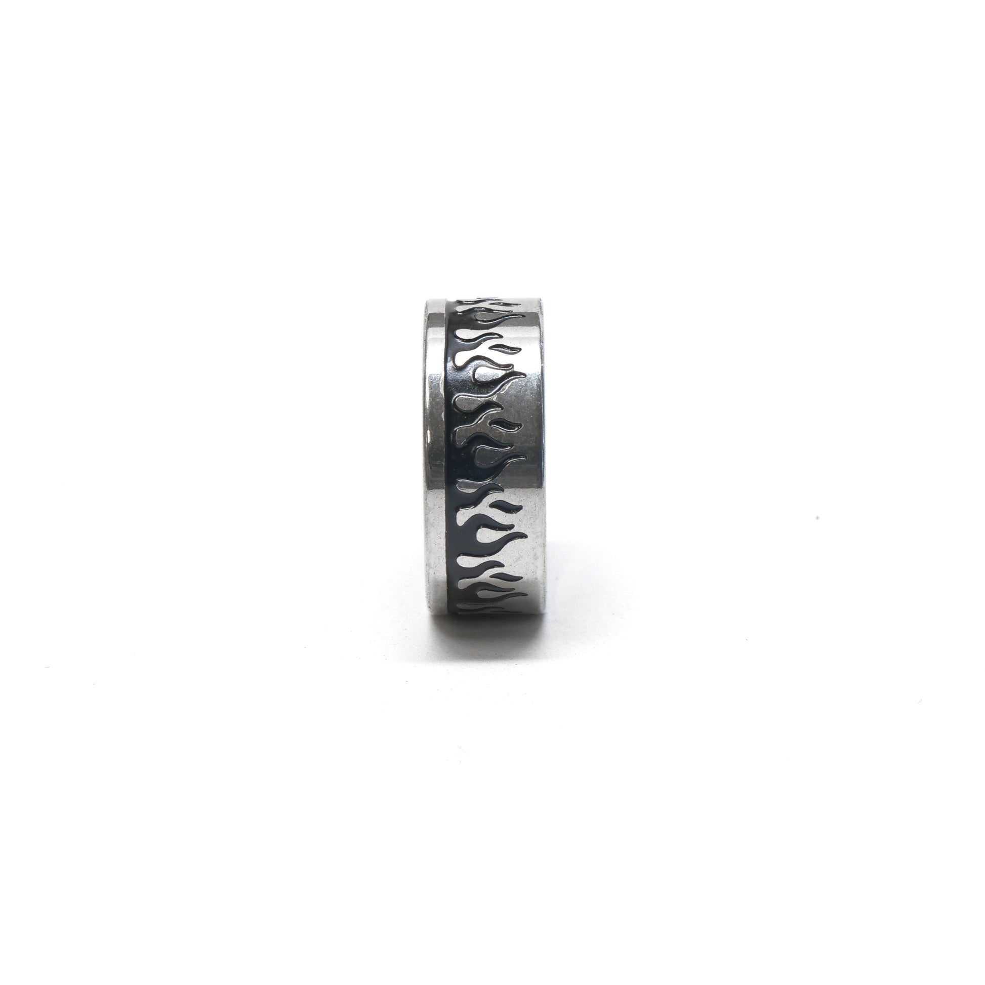 Crafted from high-quality, tarnish-resistant stainless steel, this ring features a striking flame design that wraps around the entire ring. This bold artwork is engraved to give texture against the polished band.