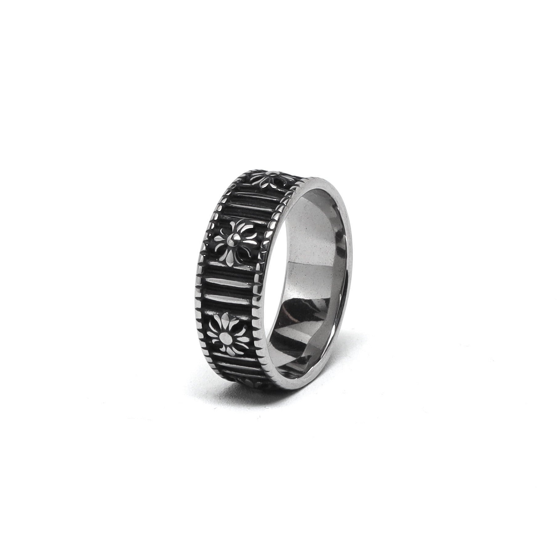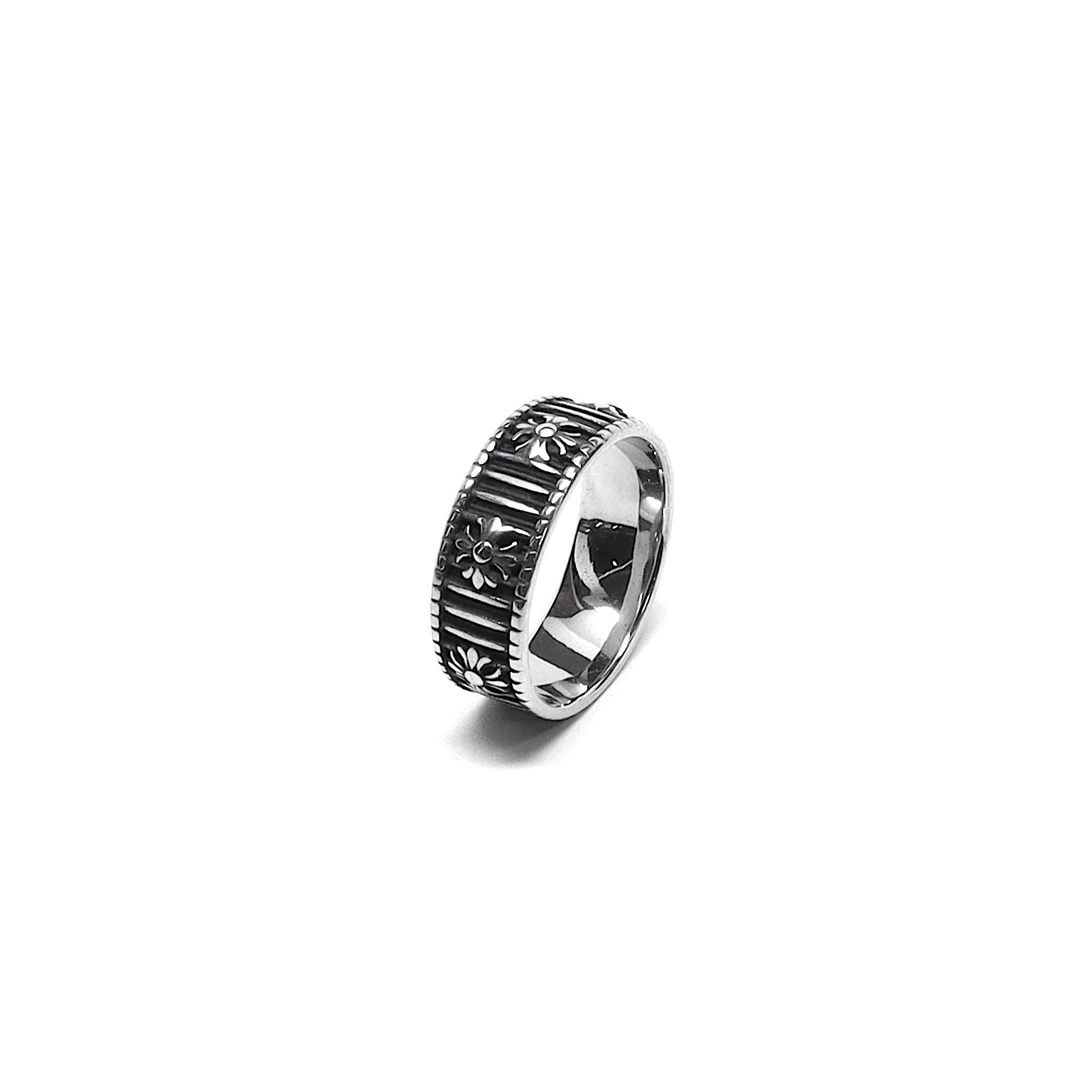 Crafted from high-quality, tarnish-resistant stainless steel, this unisex ring features a bold blackened band etched with detailed floral patterns. The contrast between the dark backdrop and the shining steel highlights every single petal.
