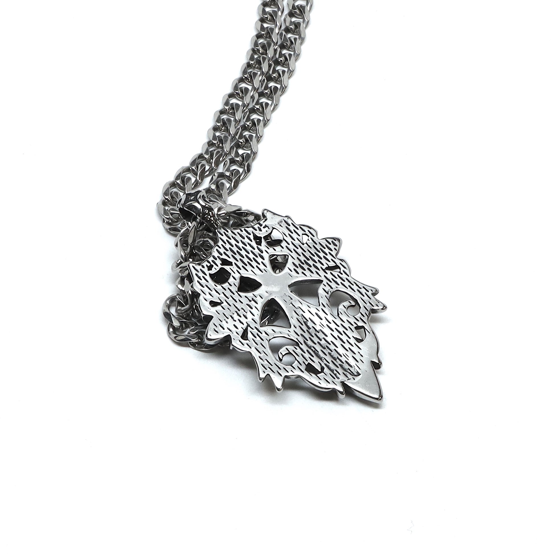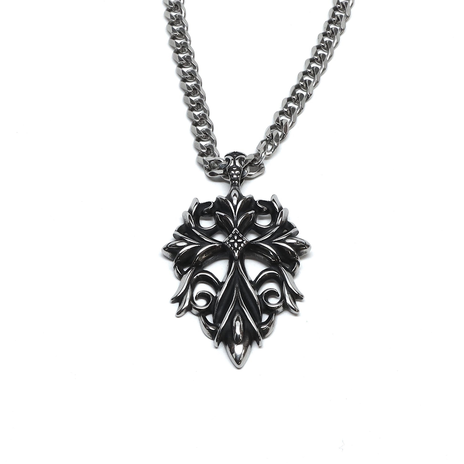 Crafted from high-quality, tarnish-resistant stainless steel, this unisex necklace features a large cross with inspirations of older European artistry and gothic style. The art resembles blooming petals carved from oxidized dark stainless steel while the intricate curves give it a powerful presence.